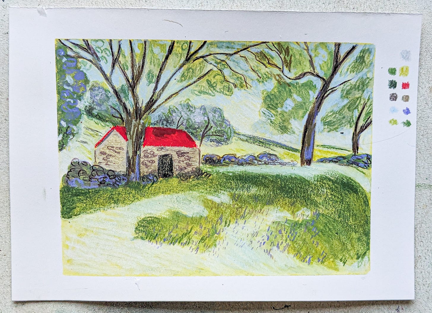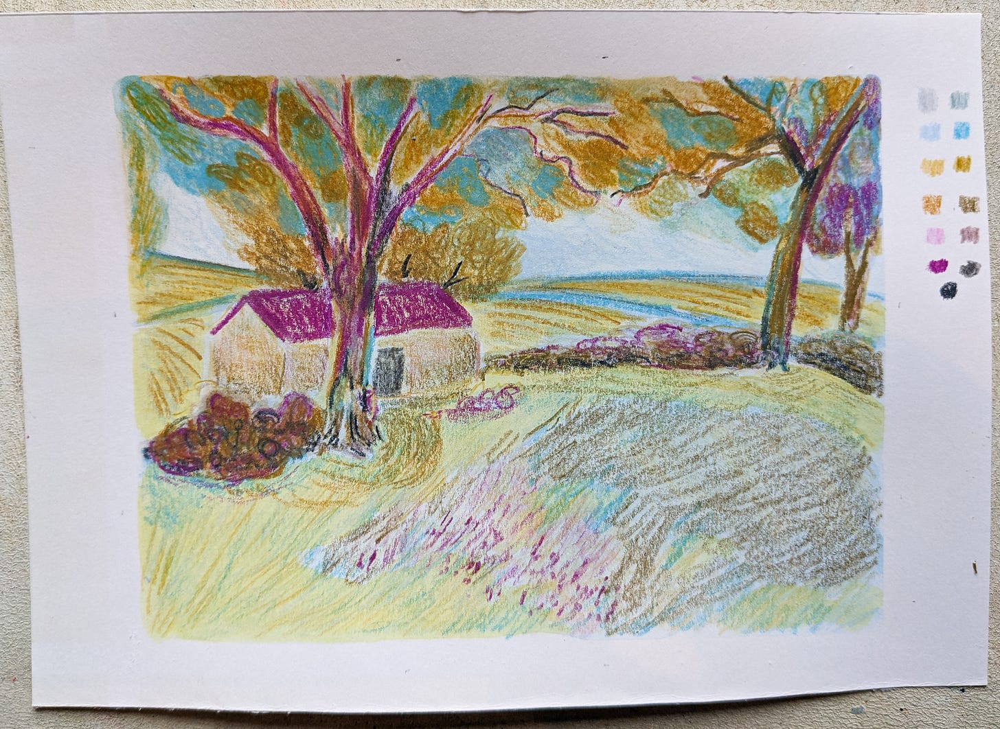 I first tried out an underpainting in Amur Yellow (Holbein Gouache), covered with pencils and neocolours, experimenting with Zest-it blending medium. Then I decided I’d try and be a bit more adventurous with colour, choosing a palette from Wada Sanzo’s Dictionary of Colour Combinations. I used Holbein’s Myosotis Blue as the underpainting of version 2.