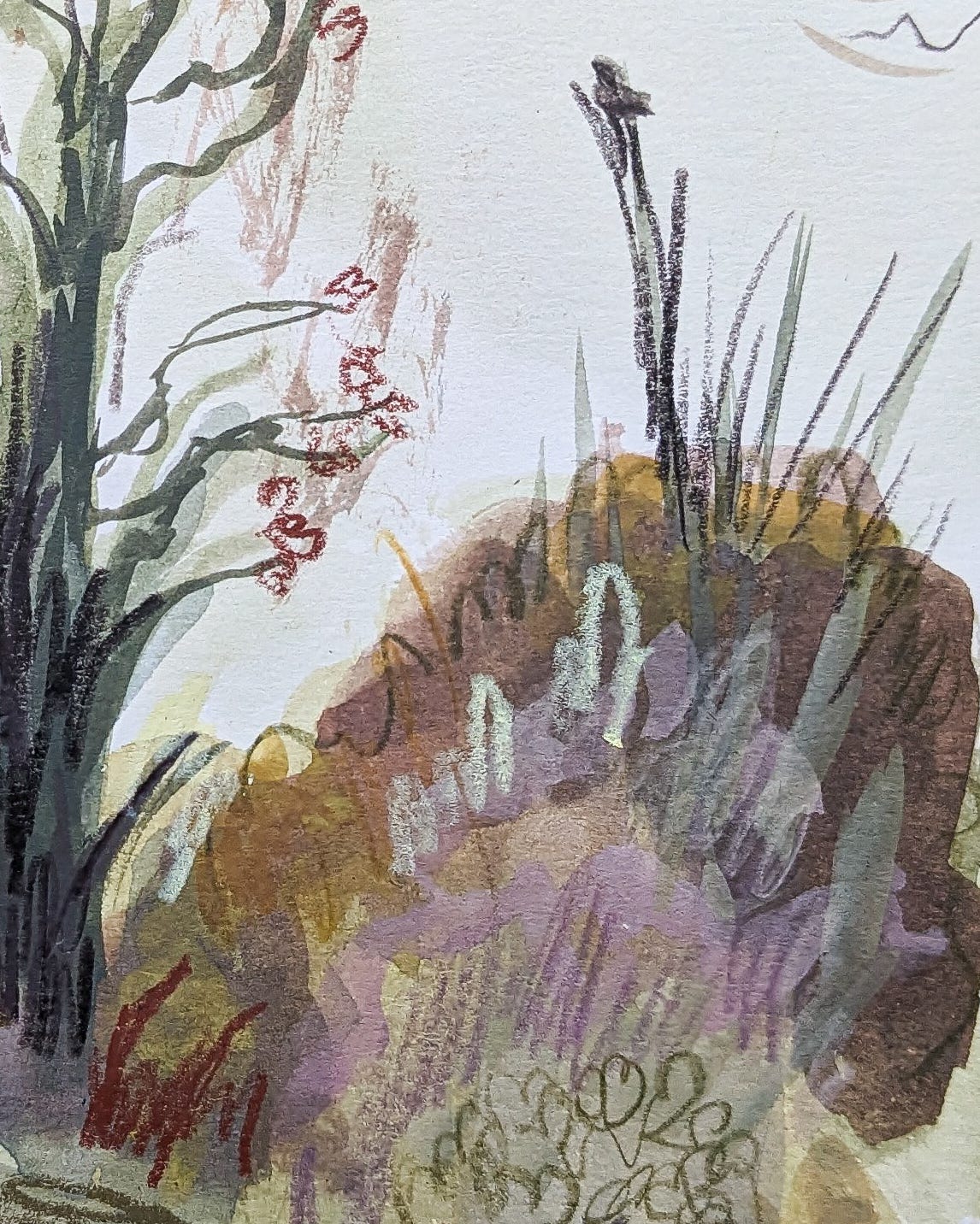 Sketchbook Notes: I have drawn from a couple of photos from unsplash.com. I always gravitate towards autumnal colours, so this isn’t such a seasonally appropriate likeness! For this, I used more wet materials than I have lately, returning to my gouache collection!